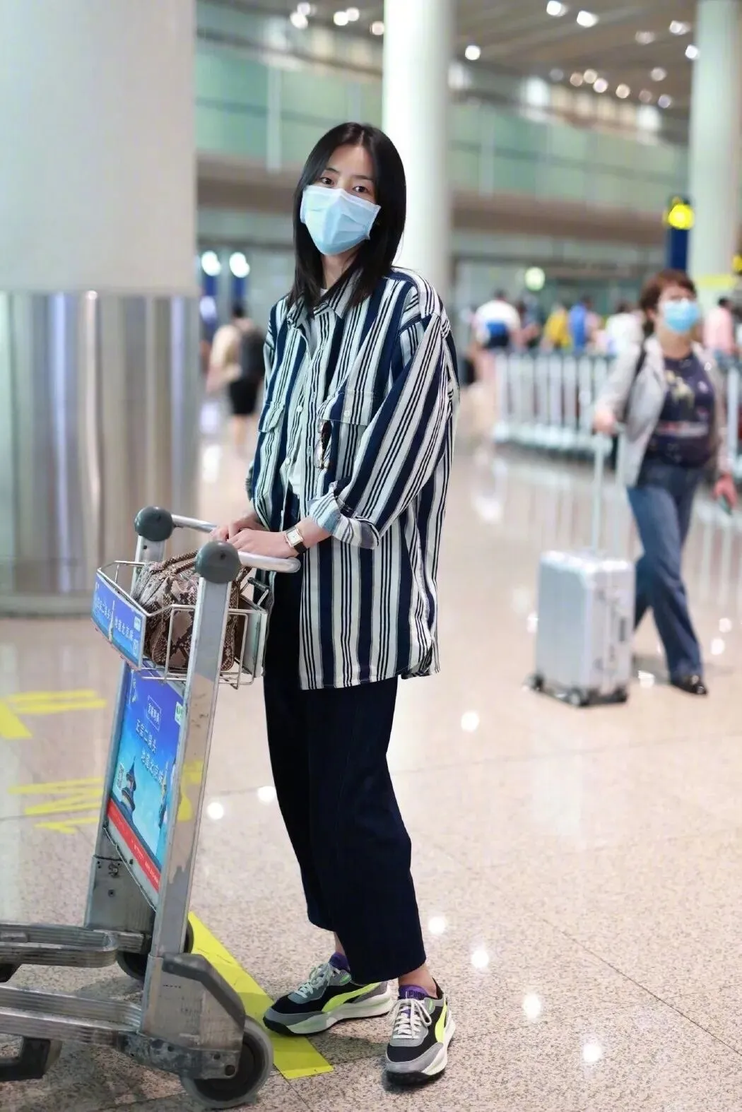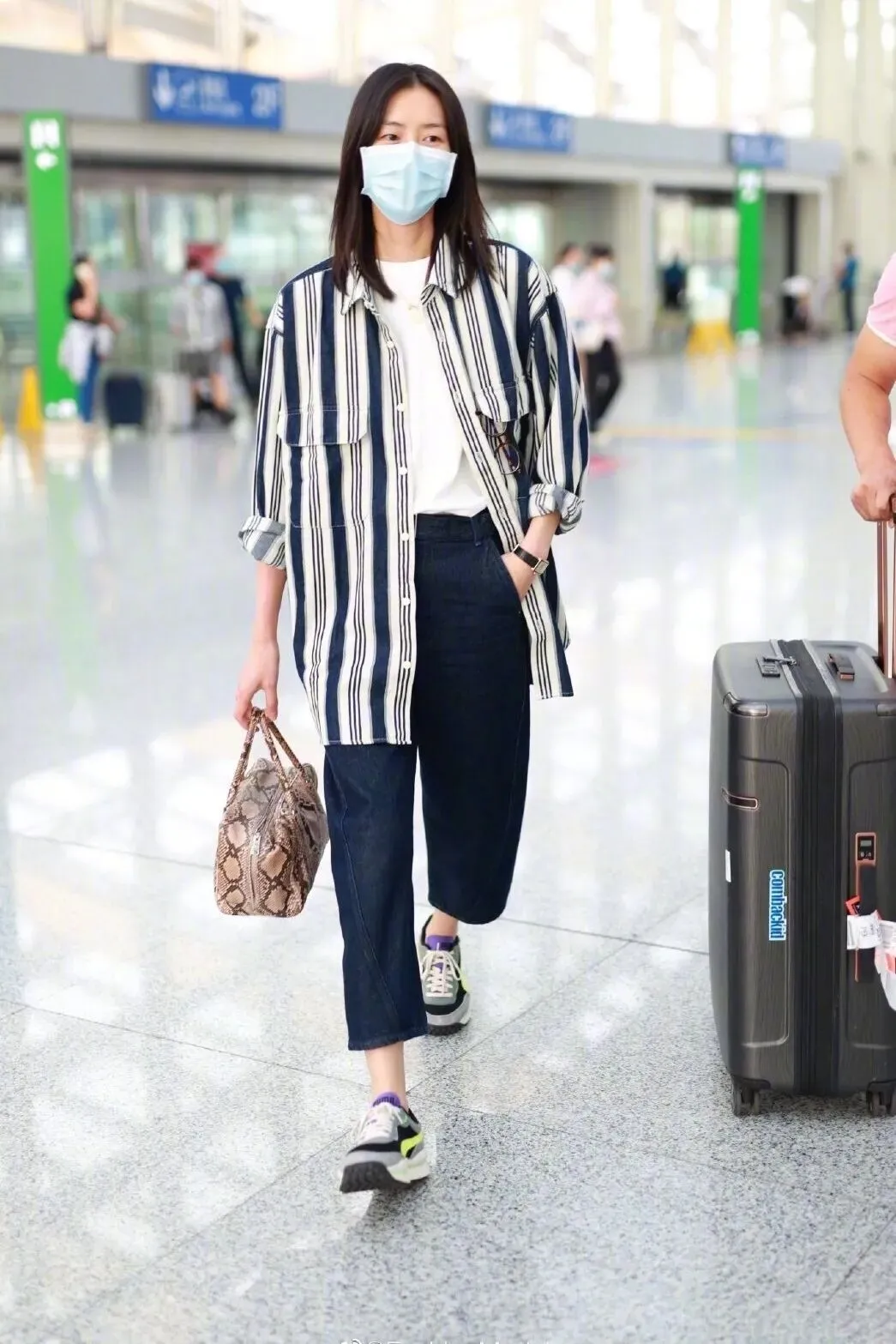 机场穿搭也是兼具了实用性和美感,蓝白条纹衬衫搭配上牛仔裤运动鞋,简简单单的搭配清爽干净又舒服,初秋这么穿怎么可能不吸睛呢!