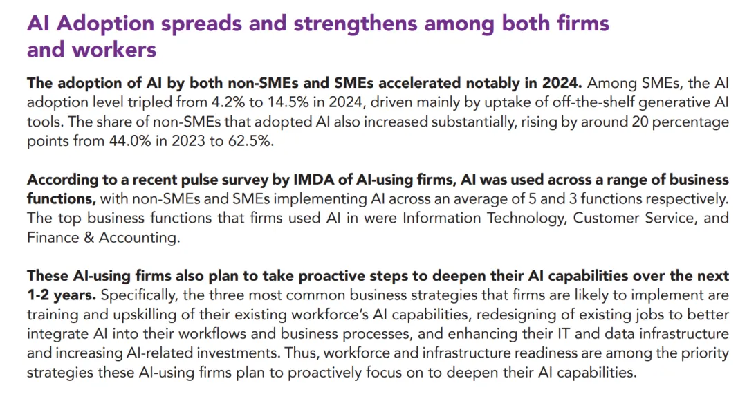 去年10月,新加坡资讯通信媒体发展局 (IMDA) 发布的《新加坡数字经济 (SGDE) 报告》指出,到2024年,14.5%的中小企业已经应用人工智能,非中小企业人工智能采用率也已跃升至62.5%。