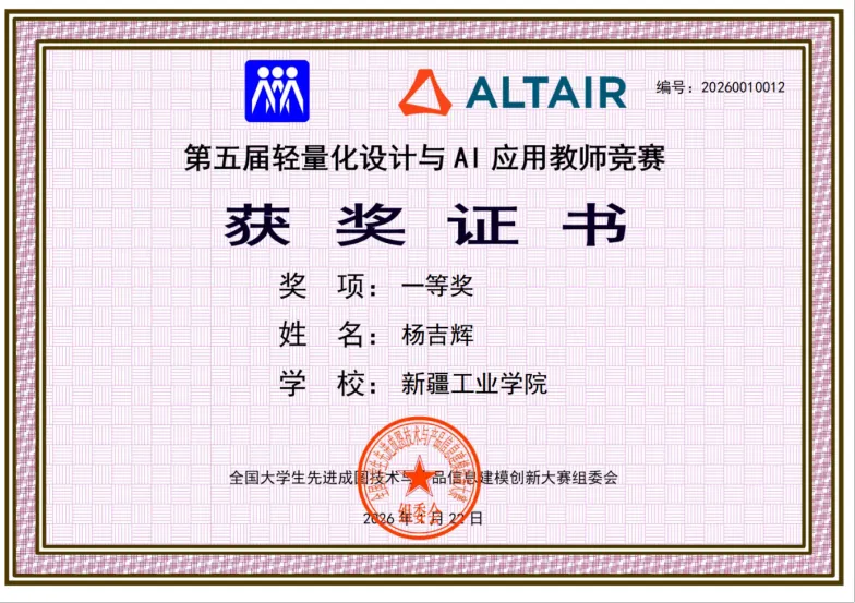 本次竞赛由全国大学生先进成图技术与产品信息建模创新大赛组委会与西门子澳汰尔工程软件(上海)有限公司联合举办。赛事紧扣新工科建设方向,聚焦轻量化设计与人工智能技术的深度融合,全面考察教师在结构优化、AI建模及工程实践等方面的综合能力。备赛期间,杨吉辉老师从零开始学习Altair Inspire和AI Studio两款软件,广泛搜集资料,反复练习,最终提交的作品以创新性、合理性和完整性获得评委高度认可,展现了我校教师严谨治学、追求卓越的精神风貌。