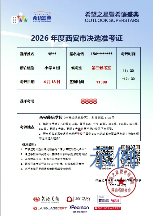 2. 请选手按照签到时间,持准考证到签到处领取考试贴