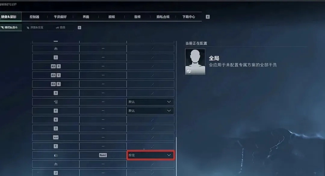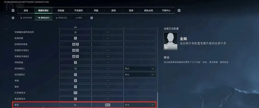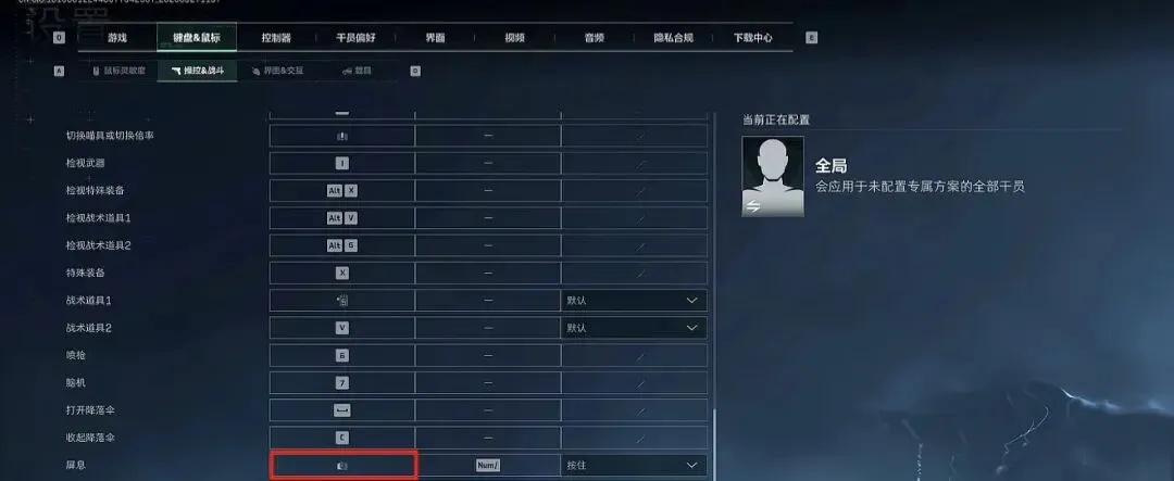 3. 滑动到最下方找到“屏息”设置,将最右侧的选项改为“按住”,并将按键设置为“鼠标左键”。