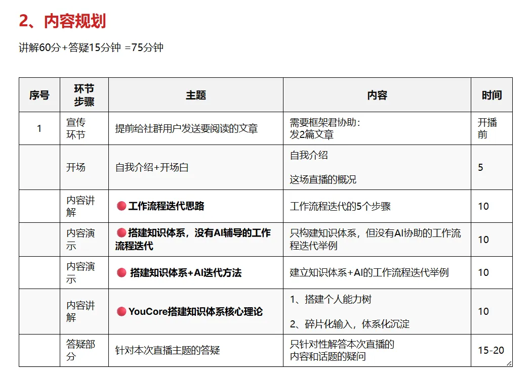 如上图所示:基于自己已经熟练的和AI给出的建议,我把直播每个环节的内容,都进一步完善,相比前面的框架建立,这一步的每个框架都填充了更多的能够指导行动的细节。