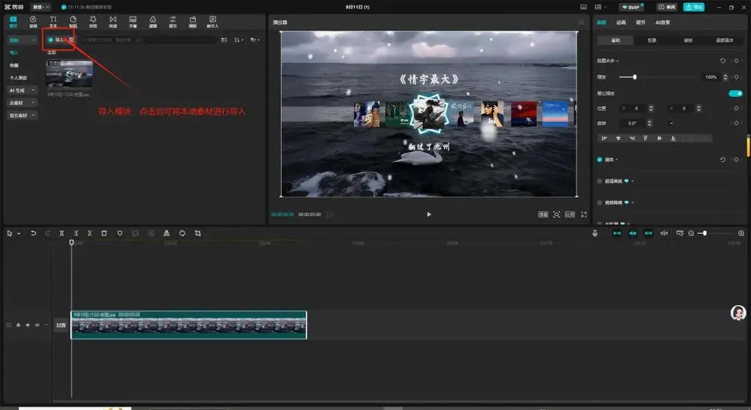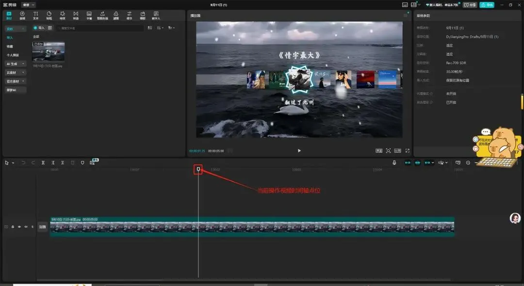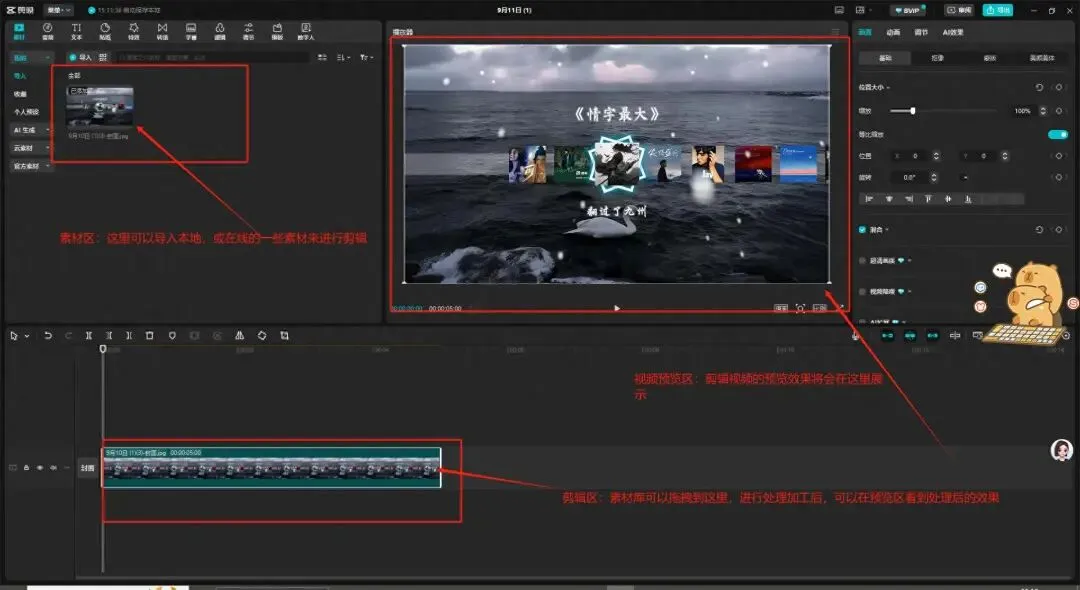 - 左侧素材区:存放视频、图片、音频等文件