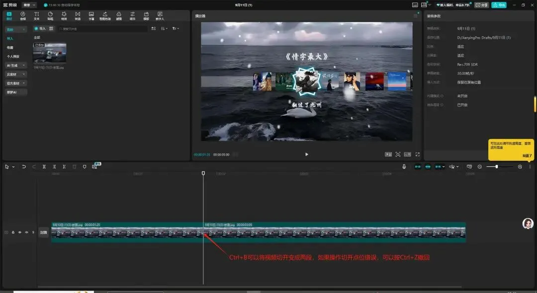 - 分割:按 Ctrl+鼠标滚轮可以放大拉长视频时间轴,可以更精准找到操作点位,播放到需要截断的位置,或用鼠标点击到需要切断的地方按 Ctrl+B 切开视频