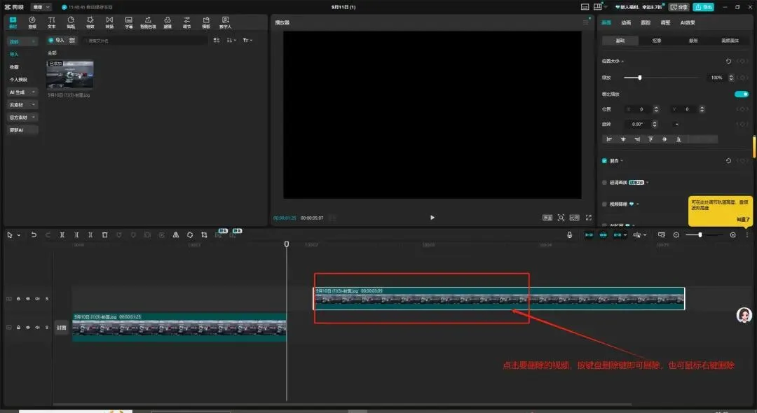 - 删除:选中不要的片段,按 Delete 键移除,也可点击视频后按右键选择删除