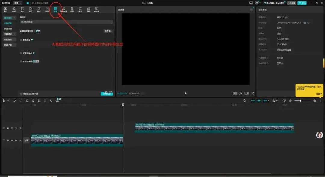 - 自动生成:选中视频,点顶部 "文本"→"智能字幕"→"开始识别",系统会自动生成字幕