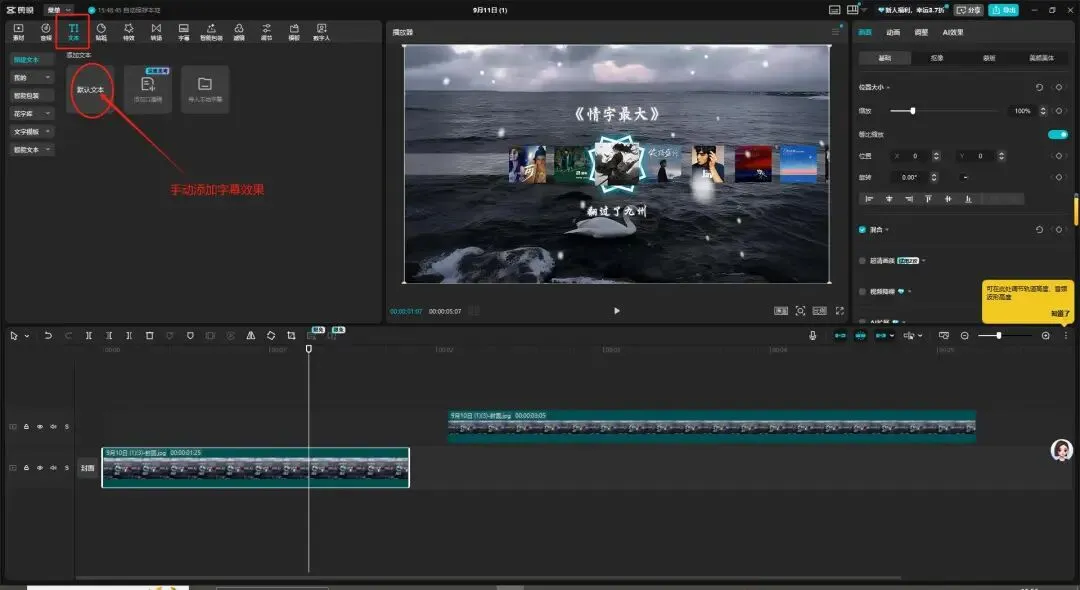 - 手动添加:点 "新建文本" 输入内容,拖动字幕条调整显示时间