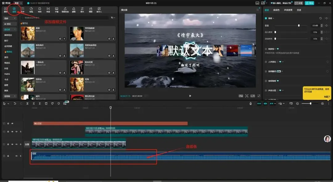 - 选中音频轨道,可拖动边缘调整长度,也能右键调整音量