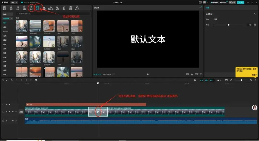- 转场:在两个视频衔接处,点 "转场" 选效果,让过渡更自然(建议一个视频用不超过 3 种)