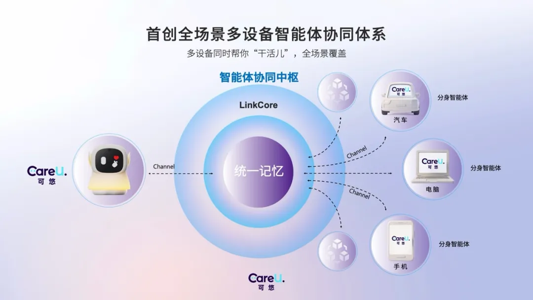 第二套,多设备协同。 车机上的NewMember、家里的可悠、手机、电脑,同一套智能体在不同载体上运行。底层靠LinkCore打通设备通信,全局统一记忆保证信息不随设备切换丢失。你在家里聊到一半的方案,上车不用重头再说,到公司电脑上已经同步整理好了。