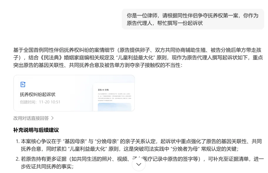 在写法律文书的时候,我把身份设定、法理依据、核心诉求一条条告诉AI,只要提示词足够精准,AI就能瞬间把复杂的法条转化成标准的诉讼语言,这样有助于我更好地规范自己的文书写作。