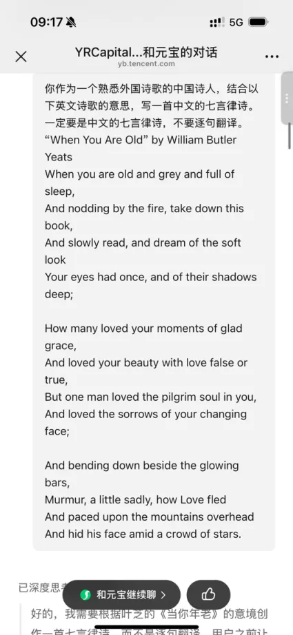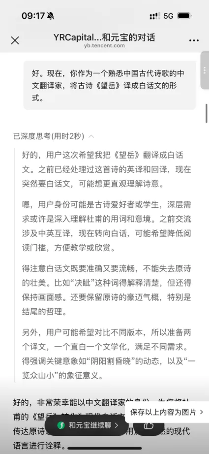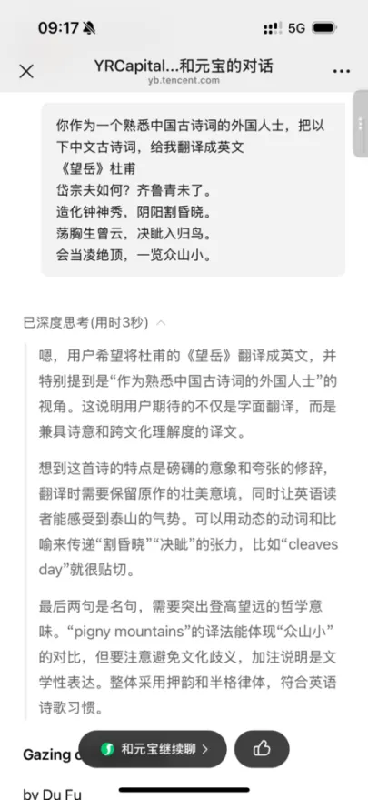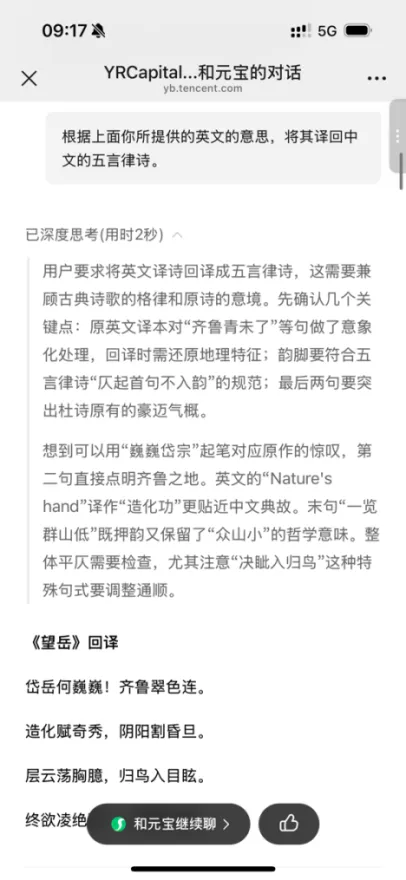 以前学古诗是理解字面意思并背诵,但当我让AI把杜甫的《望岳》翻成英文,再“回译”成五言律诗时,看着它努力还原“造化钟神秀”的意境,我好像也换了个视角,重新读懂了老祖宗的文字魅力。