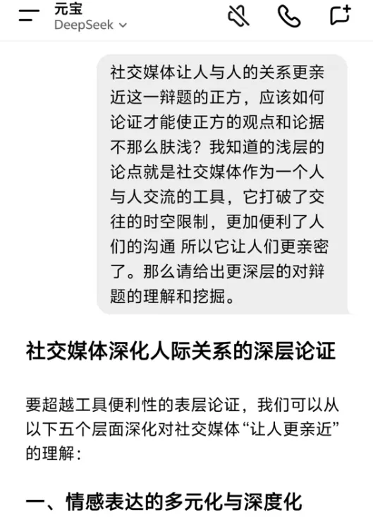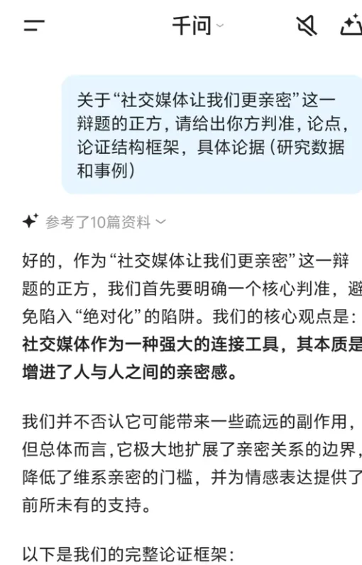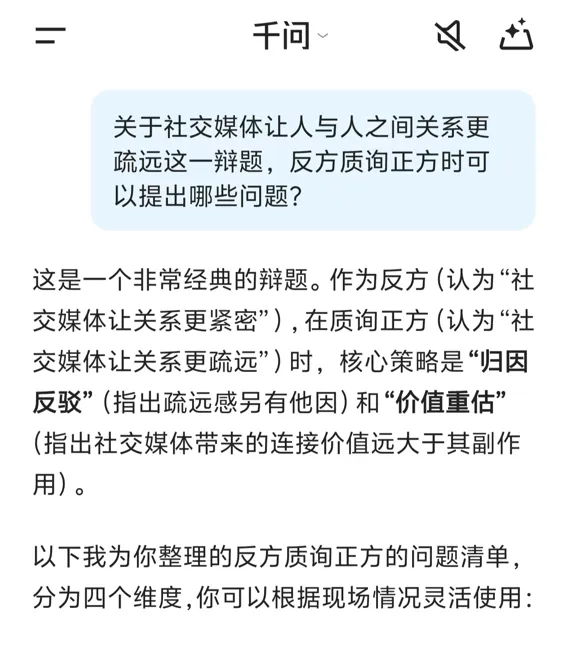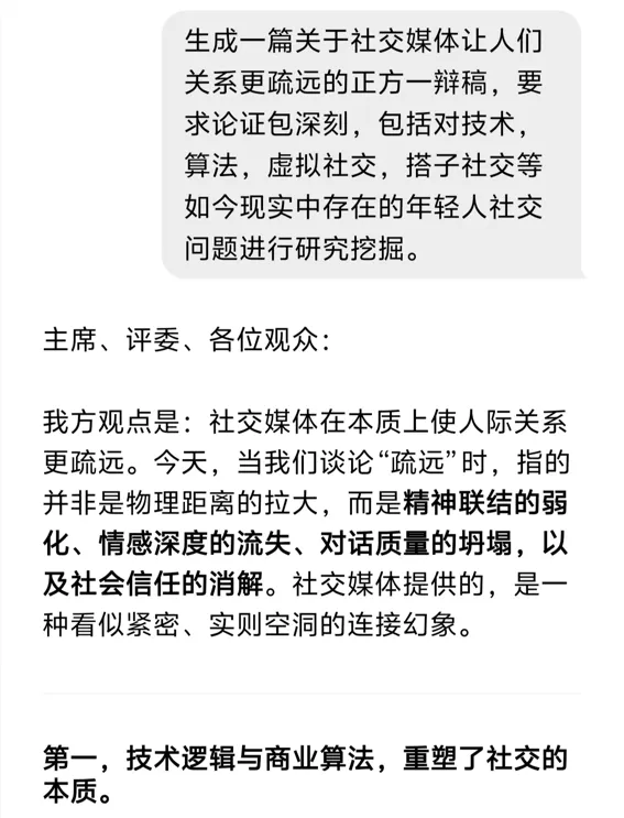 准备辩论赛时最怕陷入思维定势,觉得自己的观点很有道理,却不知道对方会从什么地方反击。而AI可以从反方的视角出发,极大地拓宽我的思路,也倒逼我围绕辩题进行更深度的思考。