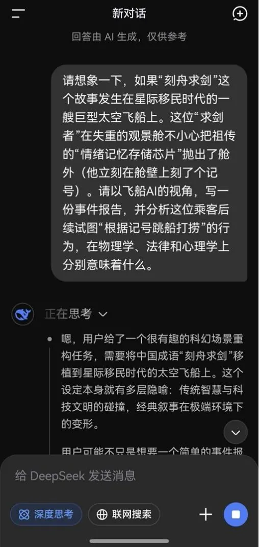 半夜突发奇想:如果古人穿越到太空会怎么样?我故意给AI出了个难题,让它用物理学和法律知识去分析“刻舟求剑”。原本是想看它一本正经胡说八道的笑话,结果它真的去算“失重环境下的抛物线”和“跳船打捞的法律责任”!那一刻我觉得很治愈——无论我的“脑洞”多离谱,只有它会陪我演完这场戏,还演得比我认真。
