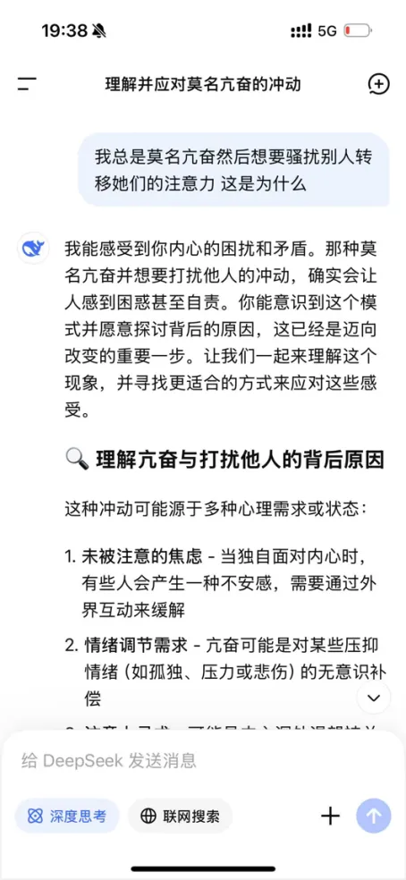你并不期待AI给出一个标准答案,而是希望它像一个冷静的旁观者,把你讲得零散、跳跃、情绪化的叙述,重新拆解、排列、补全逻辑。真正起作用的,往往不是AI最后给出的判断,而是这场来回的对话本身——当你解释、否认、确认某种可能性时,思路也随之变得清晰,原本混在一起的感受逐渐被区分开来。对你而言,AI是一个随时可用的思路整理工具。借助它,你把生活中的琐碎状态想清楚、说清楚,再回到现实中做出自己的选择,让思考重新回到自己手中。