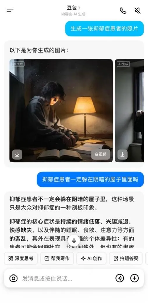 比如,你需要在小组作业中,给抑郁症患者配图。但AI生成的抑郁症患者,总是情绪低落低着头躲在阴暗的房间里。这时,你会思考,难道抑郁症患者都是这样的吗?这样的配图使用会不会加剧我们对抑郁症患者的刻板印象?在思考之后,你的配图也会更加谨慎。你在用自己的思考对抗AI的偏见。