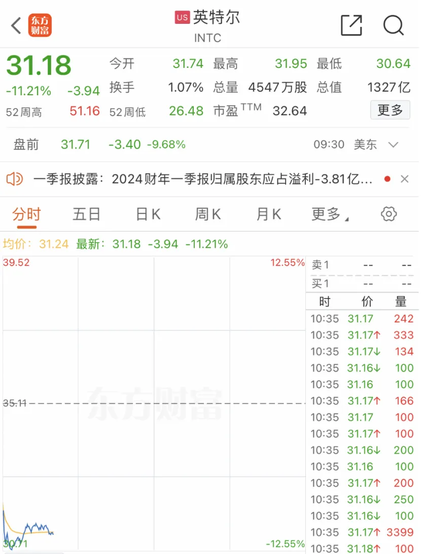 AI巨头崩了 北京时间4月26日晚间,美股开盘后,AI巨头—英特尔股价暴跌,盘中一度大跌超12%,总市值一度蒸发超190亿美元(约合人民币1400亿元),截至22:30,英特尔跌幅仍超11%。