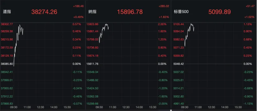 今日晚间,美股开盘后,三大指数持续走强,截至22:30,纳指大涨1.8%,标普500指数涨1%,道指涨0.5%。