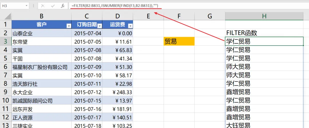 用FILTER、ISNUMBER和FIND函数,提取包含F3单元格(目前是“贸易”)的客户名称,会是重复的。