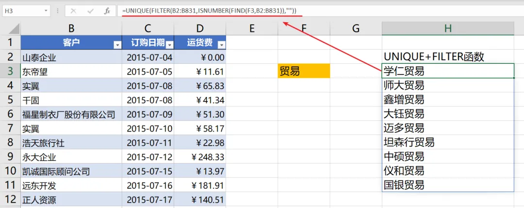 再用UNIQUE+FILTER这个经典实用的组合,提取包含“贸易”的不重复客户名称。