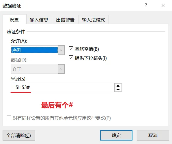 在设置数据验证序列时,不同之处在于引用来源只选择上述公式所在的单元格H3,最后一定要加上 # ,表示引用动态数组结果。
