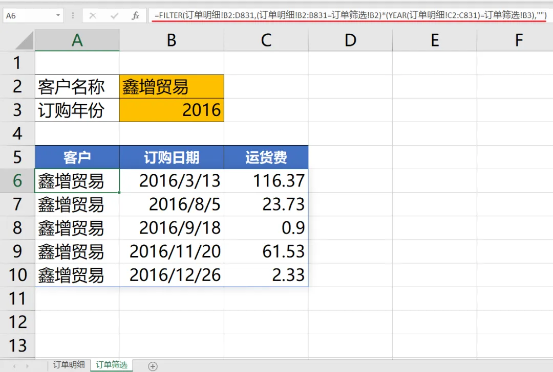 =FILTER(订单明细!B2:D831,(订单明细!B2:B831=订单筛选!B2)*(YEAR(订单明细!C2:C831)=订单筛选!B3),"")