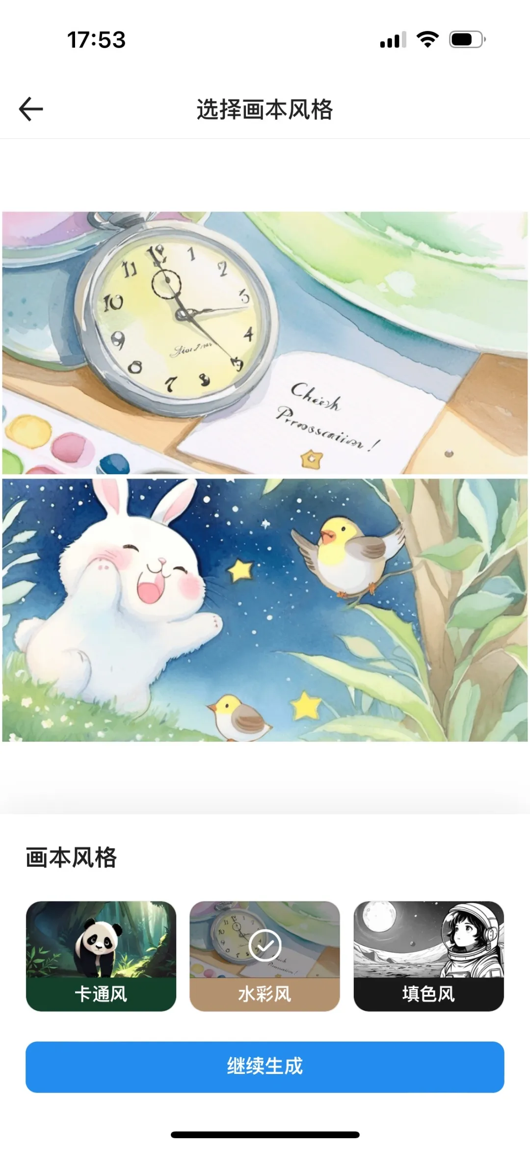 接下来,我们可以通过编辑功能对内容大纲进行微调,然后选择自己喜欢的画风进行画本生成,百度文库移动端为这项功能提供了卡通风、水彩风、填色风在内的多种常见画本风格,我们这里特地选择了百度文库特有的水彩风来进行生成。