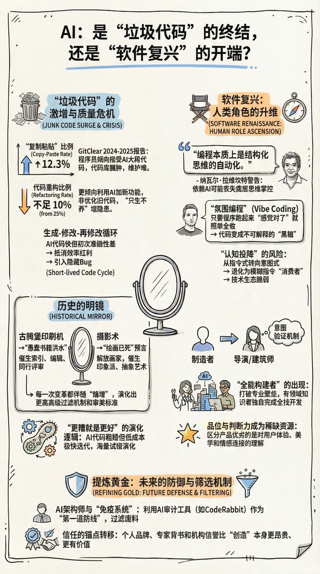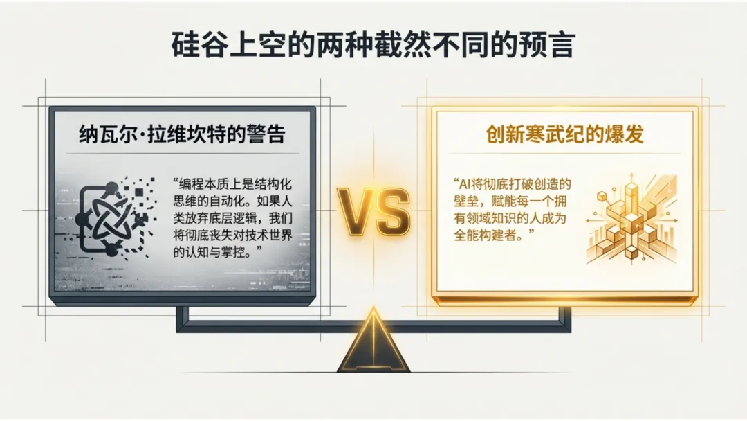 我们正处于一个历史性的极点,空气中弥漫着截然不同的两种叙事。硅谷思想家纳瓦尔·拉维坎特(Naval Ravikant)发出了近乎末日的警告:人类正进入“垃圾代码时代”。他认为,编程本质上是结构化思维的自动化,如果人类放弃对底层逻辑的掌控,将导致认知能力的彻底退化。