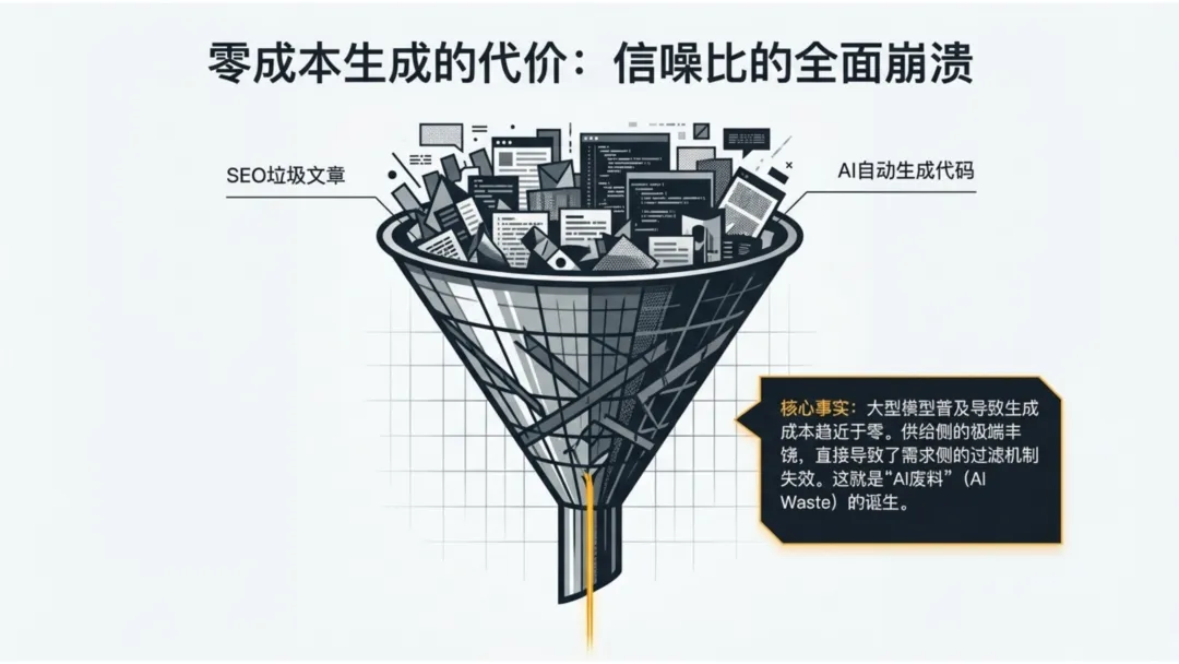 AI制造的“垃圾”实质上是资源成本暴跌带来的供给侧冲击。这是一个必要的、甚至是神圣的“熵增周期”。它迫使我们放弃对“搬砖”劳动的迷恋,转而建立更高级的过滤、治理和鉴权体系。