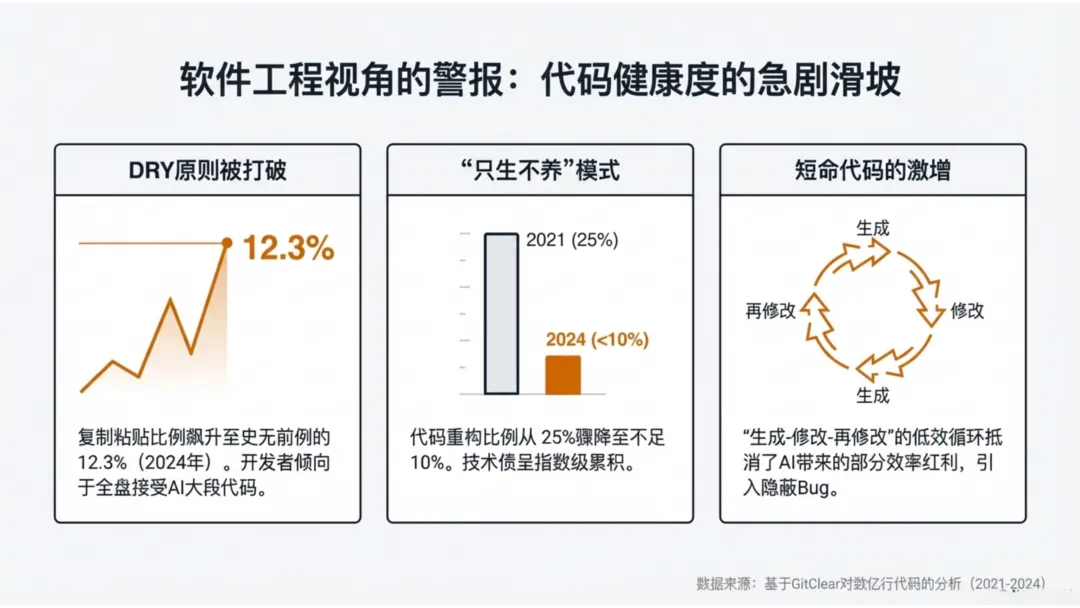 “复制粘贴”的野蛮增长:代码库中“复制粘贴”的比例在2024年飙升至12.3%,创下历史新高。这标志着经典软件工程中“DRY”(Don’t Repeat Yourself)原则的全面崩塌,开发者正沦为AI生成内容的搬运工。