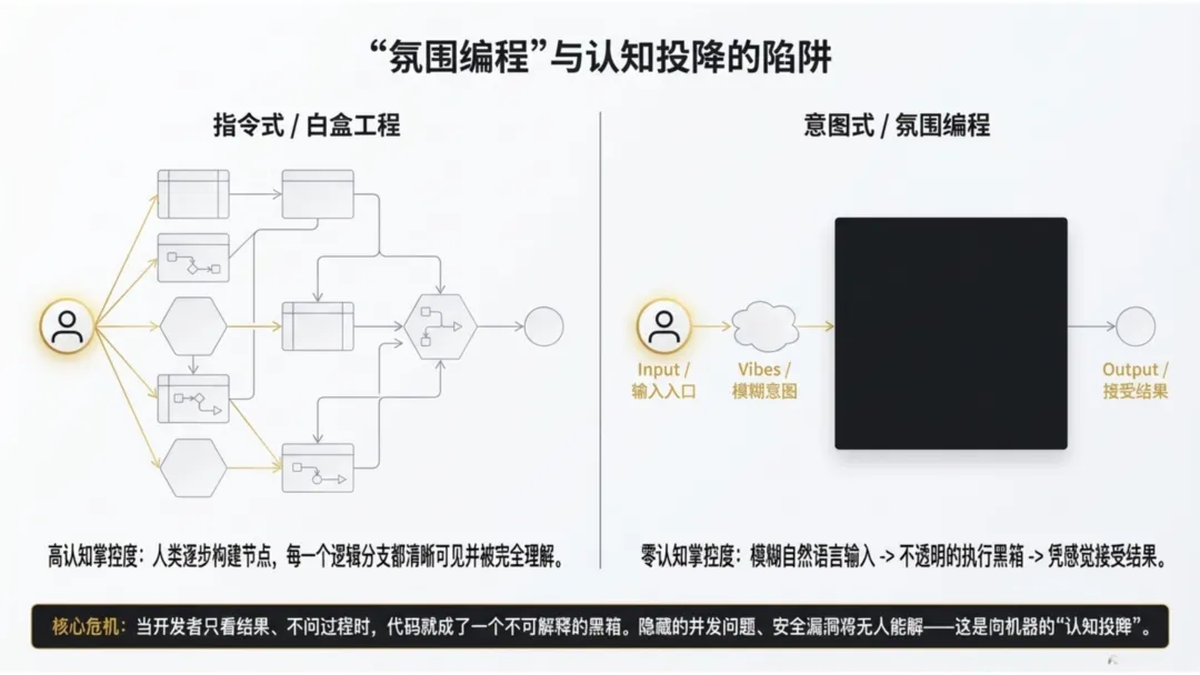 这里的讽刺之处在于:虽然英语正在成为最热门的编程语言,但它反而对“说话者”提出了更高的逻辑精确度要求。若无法将意图进行“结晶化”表达,生成的产物便只是堆砌的废料。一旦底层逻辑变成了不可解释的“黑箱”,当隐藏的并发漏洞或安全隐患爆发时,缺乏底层构建能力的“氛围开发者”将无力应对。