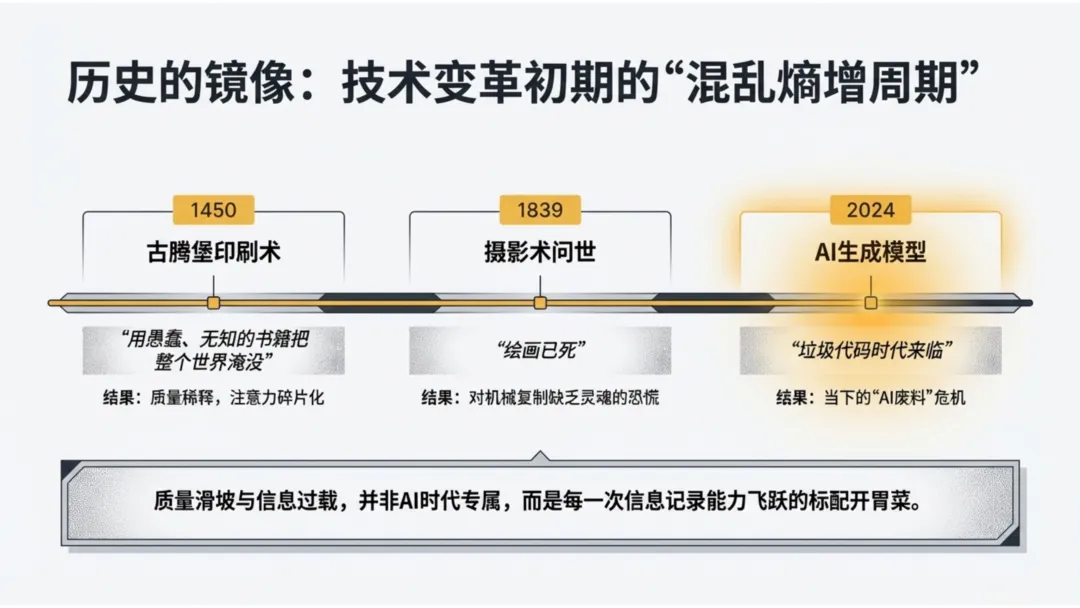 作为数字人文观察者,我们必须意识到,“质量恐慌”与“信息过载”几乎是每一次信息技术变革的标配。