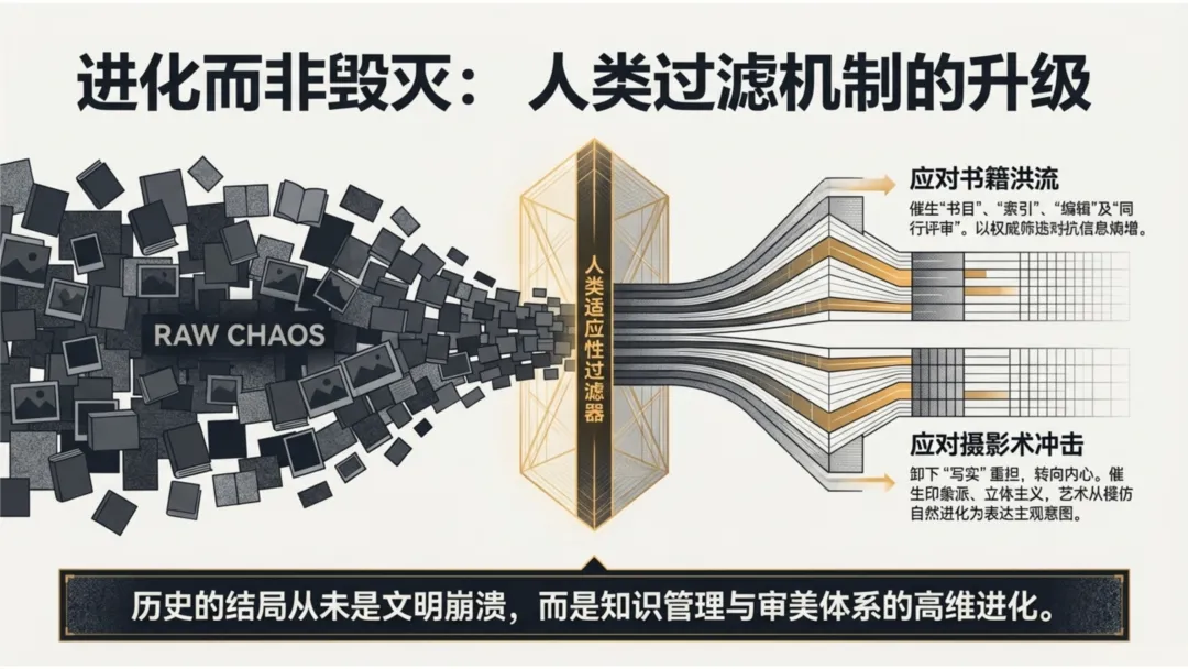 正如摄影术将画家从“记录现实”的苦役中解放出来,促成了现代艺术的诞生;AI废料的洪流也将迫使人类进化出更强大的过滤系统。