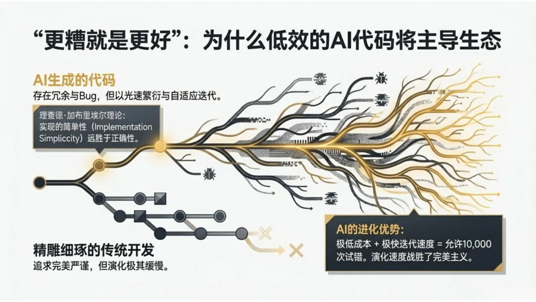 该理论认为,实现的简单性往往比正确性更具生存优势。AI生成的代码虽然冗余、粗糙,但其核心优势在于:极低成本下的万次试错。 纳瓦尔认为判断力是经验的复利,而AI允许我们进行大规模的迭代。即使单次产出是“垃圾”,通过10,000次快速迭代筛选出的系统,其演化速度极有可能超越由顶级工匠精雕细琢、却演化缓慢的传统软件。这是一种“算法优胜劣汰”对“人工精耕细作”的降维打击。