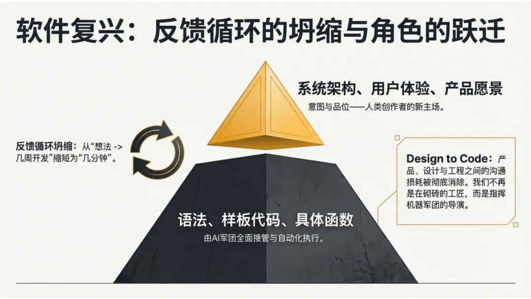 Cursor设计总监Ryo Lu提出的“软件复兴”论点,揭示了权力的转移。我们正经历从亲手烧砖的“工匠”,向指挥机器军团的“导演”转型。