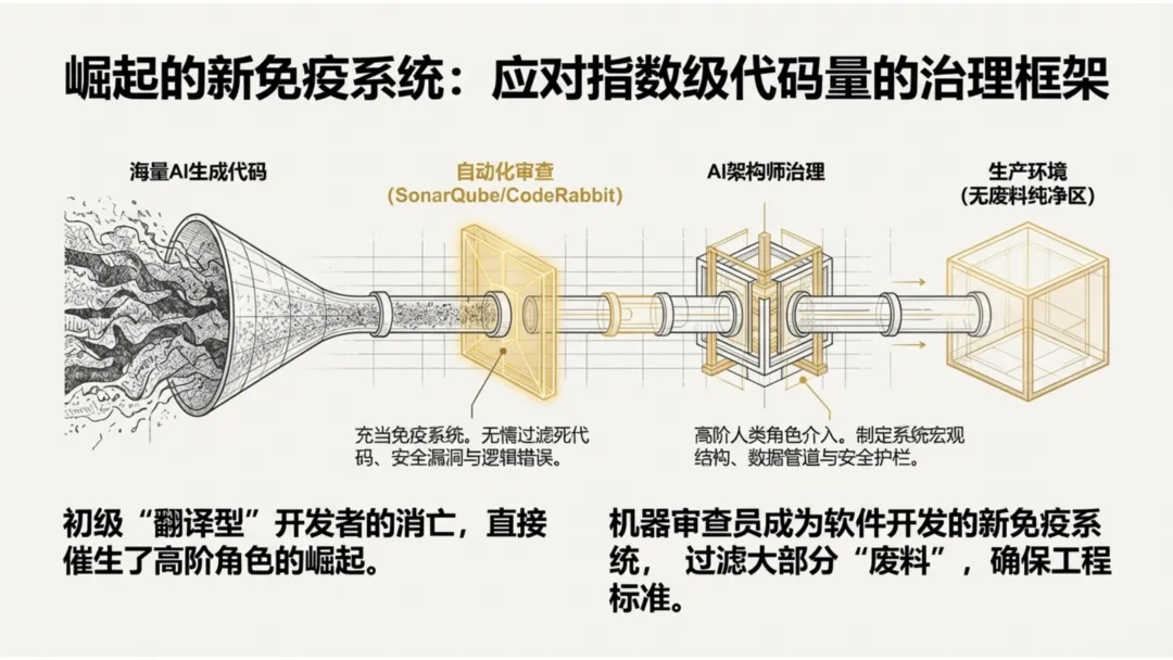 数字免疫系统:正如人体需要免疫系统,面对AI生成的代码量,我们将依赖如 CodeRabbit 等 AI 审查工具充当守门人,在洪流中拦截熵增。