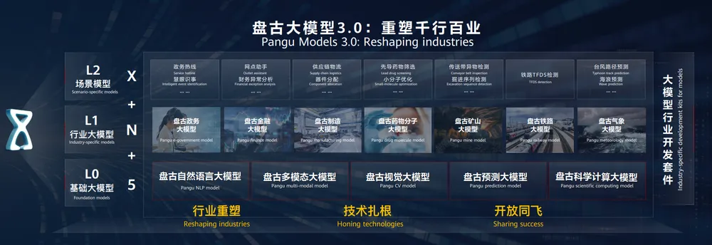 盘古大模型3.0采用分层设计,包括5+N+X三层架构:5大L0层基础大模型提供各种通用技能,N个L1层行业大模型帮助企业打造自己的大模型,海量L2层场景模型专注于具体应用场景或特定业务,为客户提供开箱即用的模型服务。算力是大模型的食粮,训练过程中,盘古各个系列大模型几乎都需要几百张、甚至上千张昇腾芯片训练,昇腾AI云服务则是盘古大模型的底座,为它提供坚实的基础。