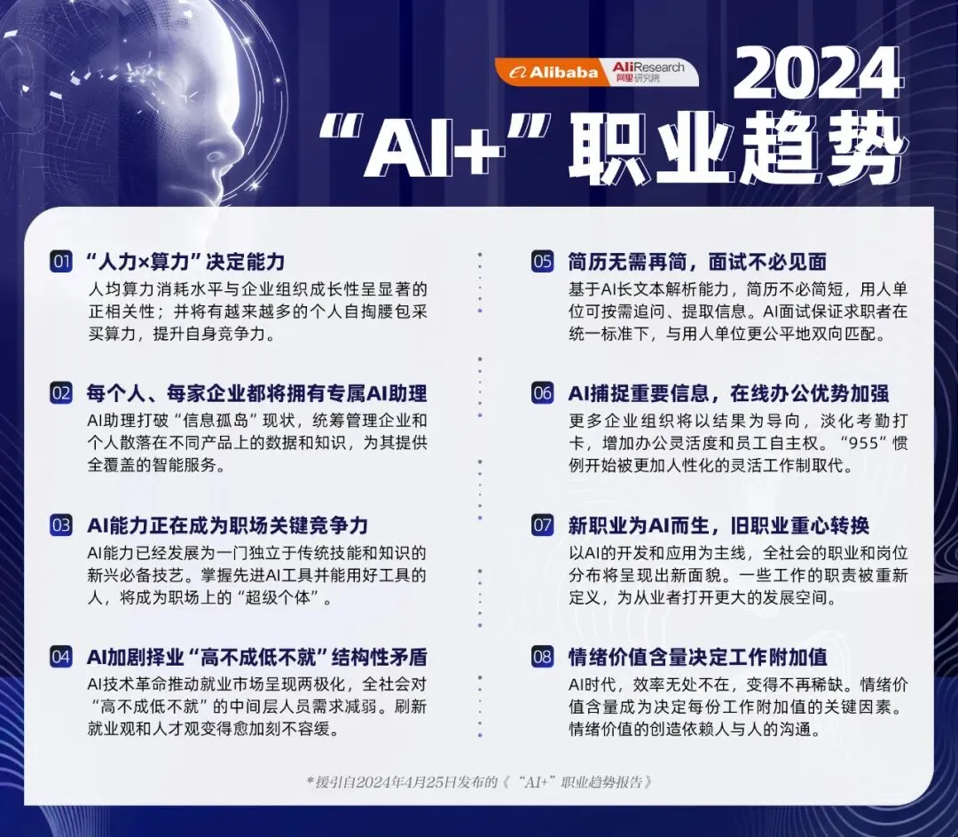 这场变革的引领者是科技大厂,春江水暖最先知的,也是科技大厂。“五一”劳动节前夕,阿里巴巴发布《“AI+”职业趋势报告》,介绍了中国职场人正在如何用AI。阿里的研究显示:AI已经进入中国的各行各业,甚至下沉到了养猪养鸡的农场。人机协作的工作方式已经成型。