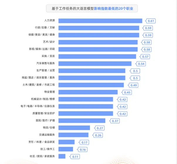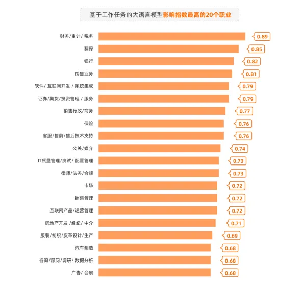 这项研究基于上百万份2018年1月到2023年4月期间的招聘数据,提炼、分析、总结出了20个最容易受大语言模型影响,和20个最不容易受影响的职业。意外但在情理之中的是,曾经最受追捧的大学专业对应的那些职业,很多都在“最容易受影响的职业”榜单当中,比如财务/审计/税务,翻译,银行,互联网开发/系统集成等等。