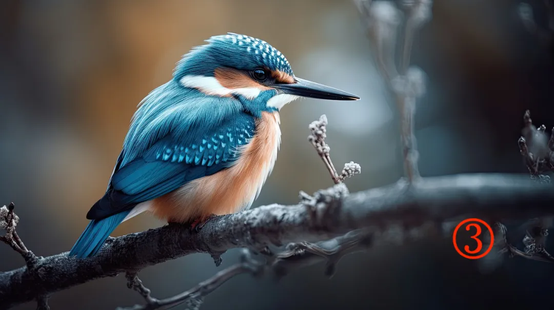 AI画图有时还会出现奇怪的对焦。例如下面这张翠鸟的图片,树枝部分的对焦效果比较奇怪,而且颈侧白斑的形态也不对。