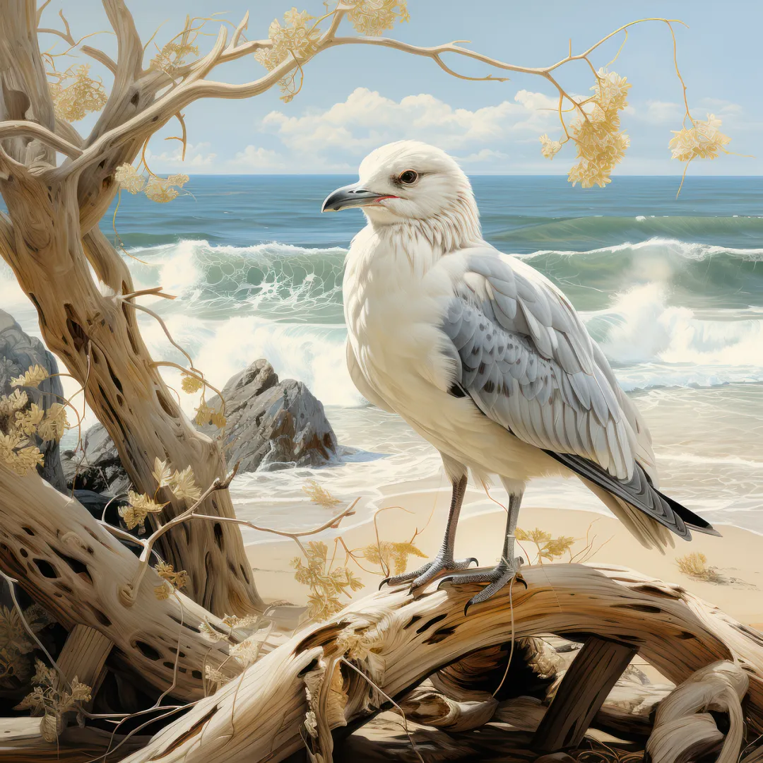 我们可以参考这种分类方式,把鸟类图片和自己熟悉的鸟进行对比。比如下面这张图,头部和配色像海鸥(游禽),轮廓和体态像鵟(kuáng)之类(猛禽),爪子又有点像鸡(陆禽)。即使你对海鸥的了解仅限于“整点薯条”,也能察觉到这张图气质不对。