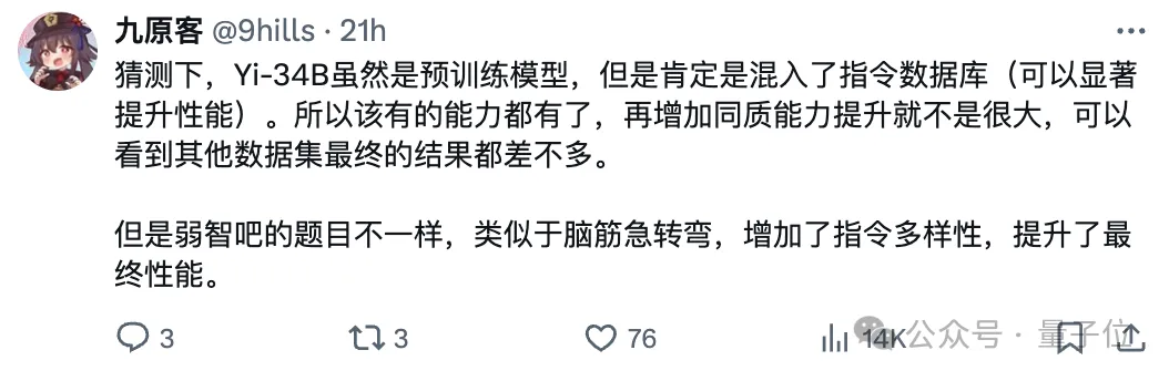 作者之一也现身评论区,透露使用弱智吧数据训练AI属于灵机一动,以前只用来测试。