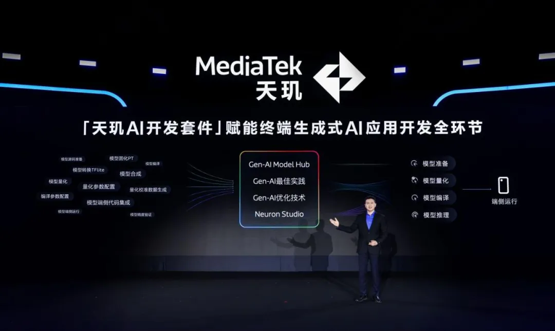 其次是敏锐的洞察力,包括对市场、对开发者需求的敏锐洞察。联发科推出了对开发者更加友好的天玑AI开发套件,包含GenAI最佳实践、GenAI Model Hub、GenAI 优化技术和Neuron Studio。