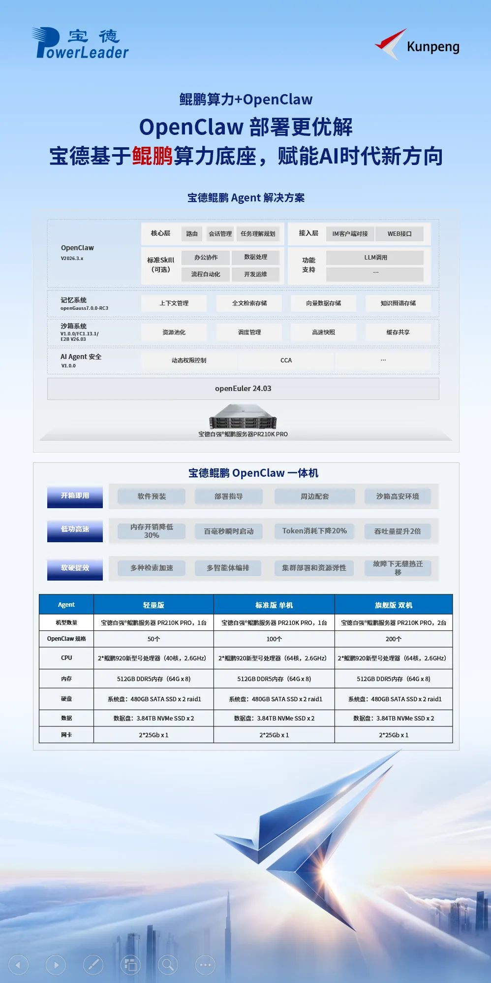 作为鲲鹏生态的核心伙伴,宝德计算推出了“宝德鲲鹏AI Agent一体化解决方案”(下文简称“宝德方案”)。该方案以自强®️鲲鹏服务器为物理底座,深度融合OpenClaw与沙箱技术,打造了宝德鲲鹏OpenClaw一体机,为企业提供了一条从硬件到应用的全栈国产化、高性能AI Agent落地路径。