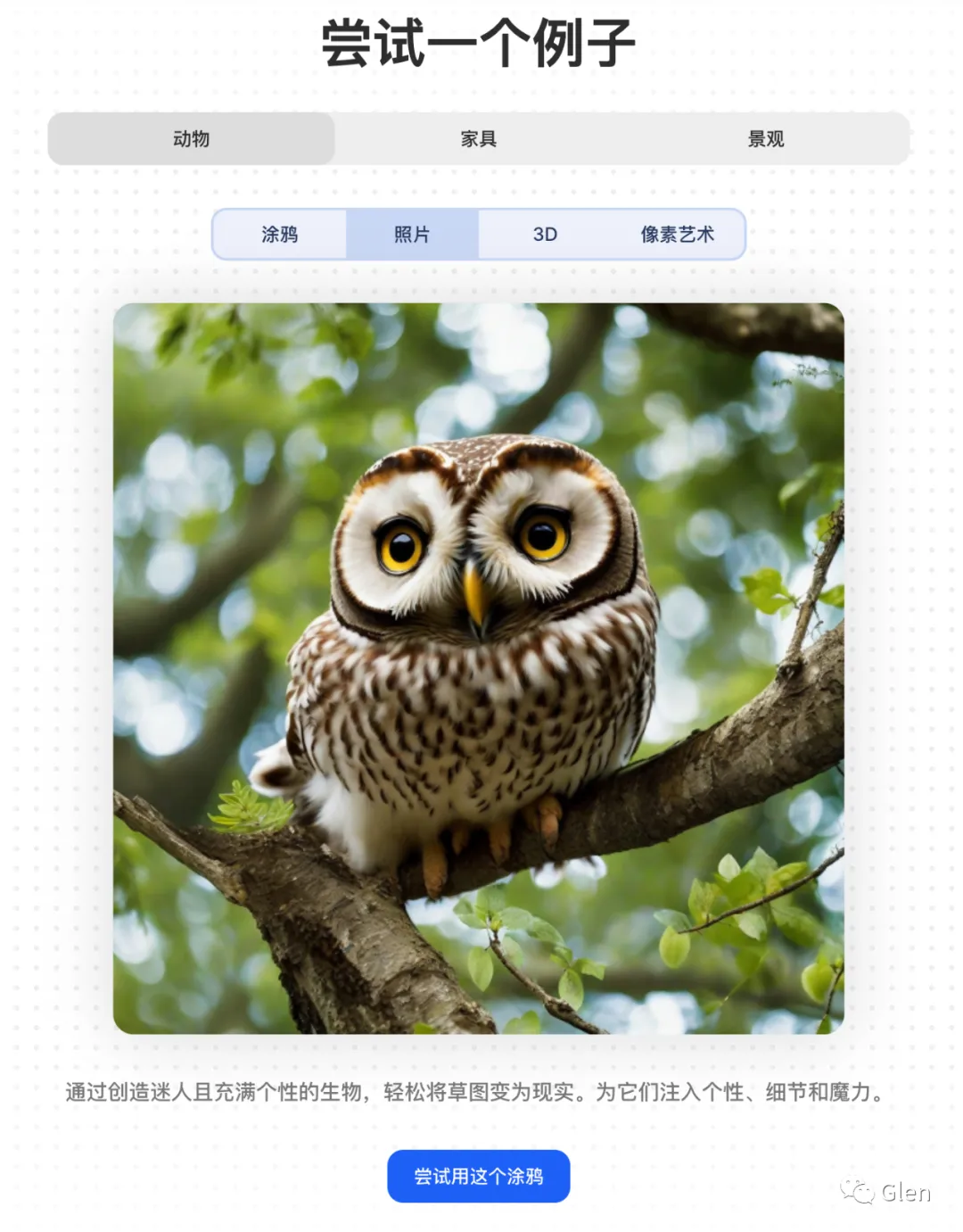 官方提供了3个例子,动物、家具、景观,点击“尝试这个涂鸦”即可体验。