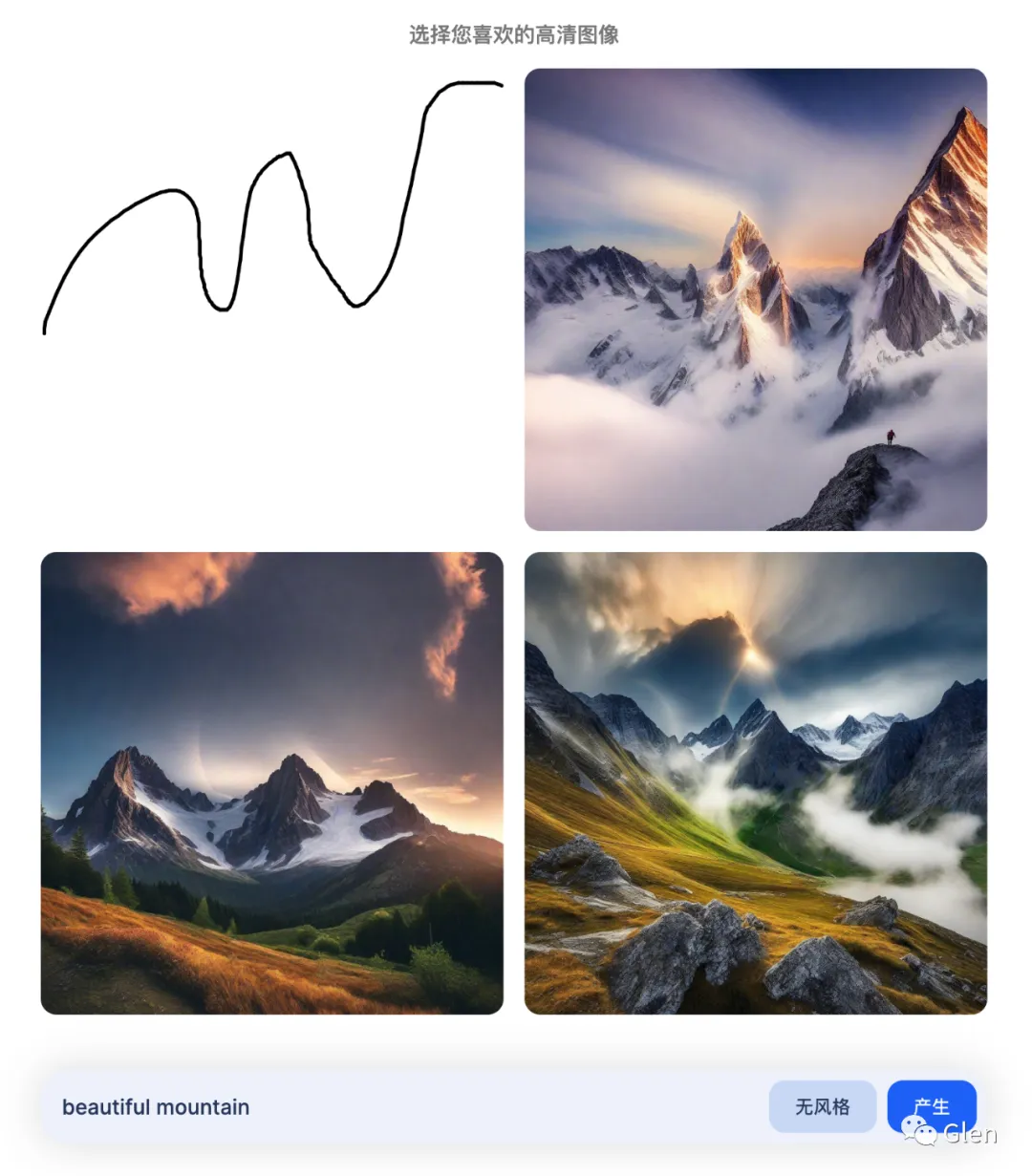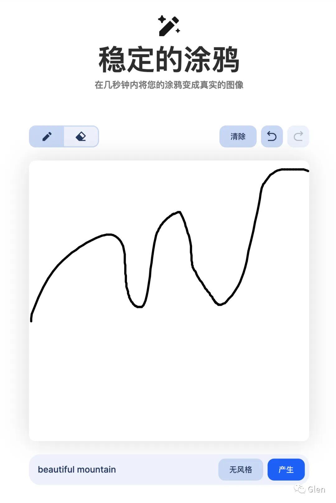 你也可以自行涂鸦,然后输入提示词,生成专属的手绘或图片。我试了下手绘山的轮廓,输入了提示词“beautiful mountain(美丽的山)”。