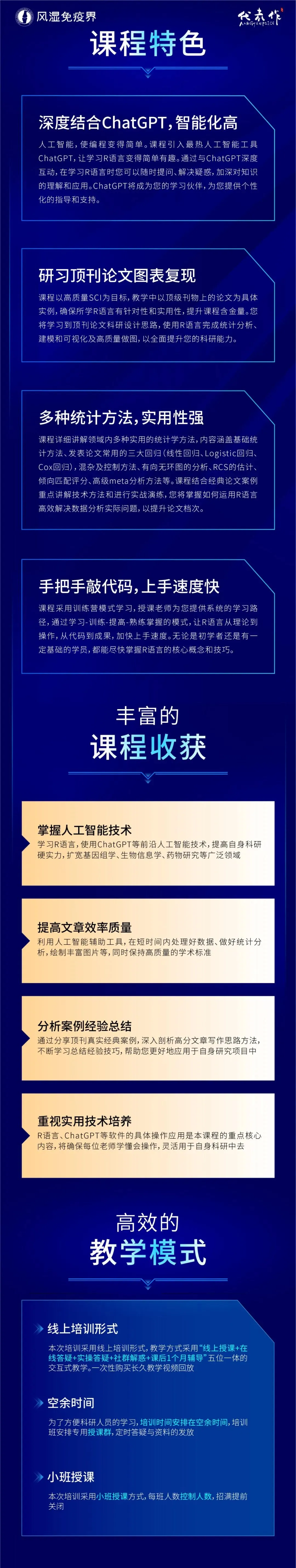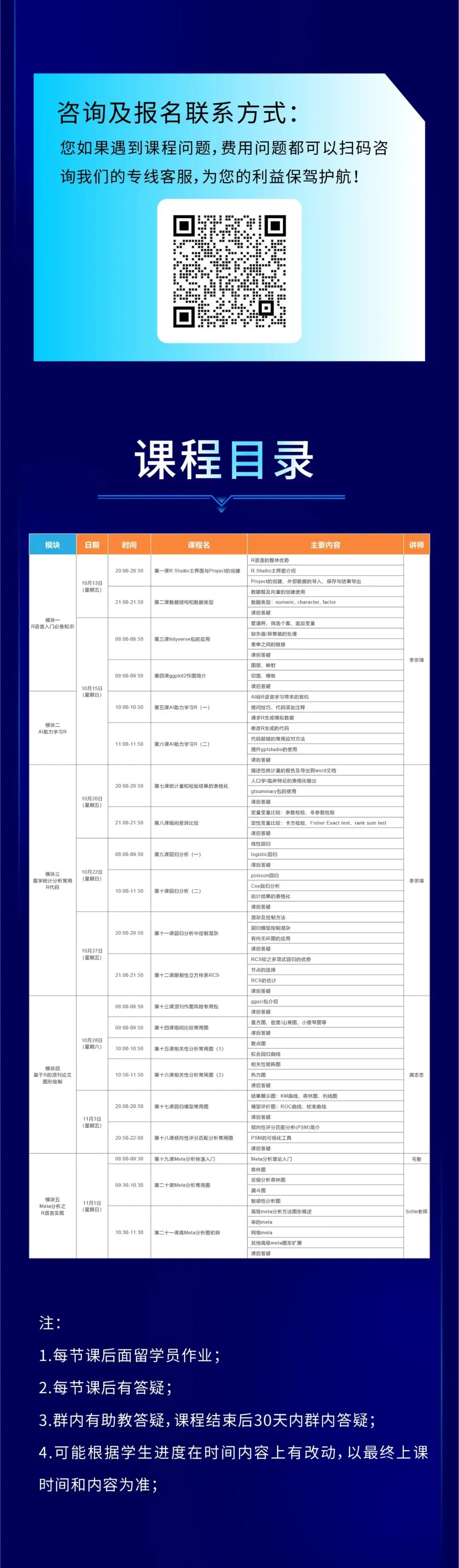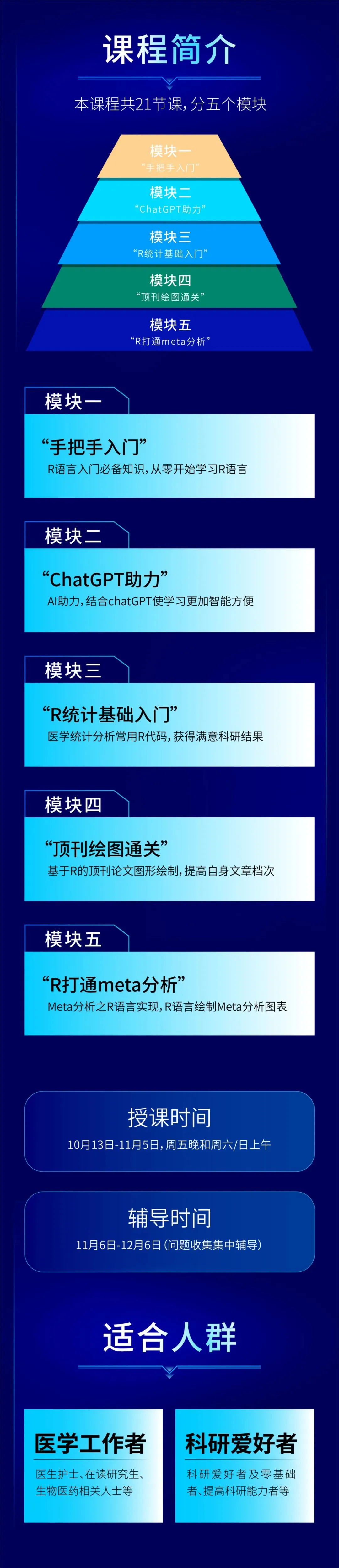 AI助力医学统计与R语言入门训练营(AI+ R语言+统计+顶刊图表复现+Meta分析)召集令!AI助力医学统计与R语言入门训练营(AI+ R语言+统计+顶刊图表复现+Meta分析)课程简介名师亲授课程特色组织机构