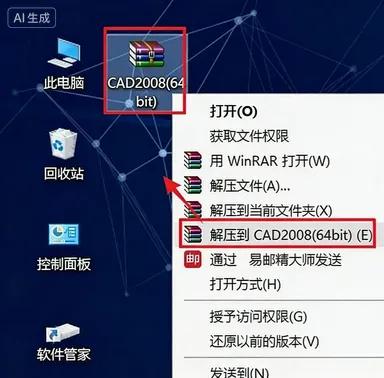 1.鼠标右击【CAD2008】选择【解压到 CAD2008】。