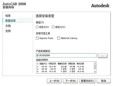 12.安装类型选择【典型】,勾选【Express Tools】和【Material Library】,点击【…】可更改安装位置(建议不要安装在C盘,可以在D盘或其它磁盘下新建一个“CAD2008”文件夹。注:安装路径中不能有中文),点击【下一步】。