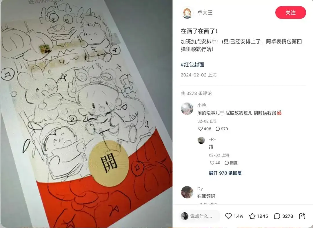 前几年的参与者大多是专业设计师和画手,我以为今年 AI 的下场会横扫这个生意,结果一个只画原创红包的画师告诉我影响不大,“人群不同,喜欢消费原创的人接受不了 AI 的风格”。